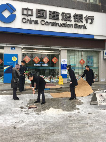 1月25日,建行懷化分行網(wǎng)點(diǎn)啟動(dòng)應(yīng)急預(yù)案,鏟冰掃雪、鋪設(shè)紅地毯,進(jìn)一步做好冰災(zāi)期間營業(yè)網(wǎng)點(diǎn)的客戶服務(wù)工作(王承 攝)