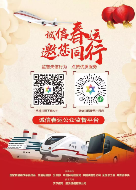 從2017年開始,國家發(fā)展改革委會(huì)同公安部、交通運(yùn)輸部、民航局、鐵路總公司等部門和單位建立了“誠信春運(yùn)公眾監(jiān)督平臺(tái)”,鼓勵(lì)旅客隨時(shí)隨地監(jiān)督春運(yùn)中的失信和不文明行為,點(diǎn)贊優(yōu)質(zhì)服務(wù)和好人好事,取得積極成效。