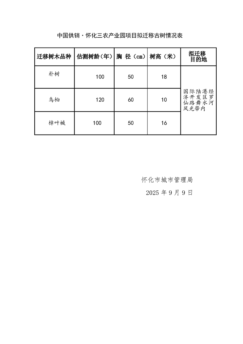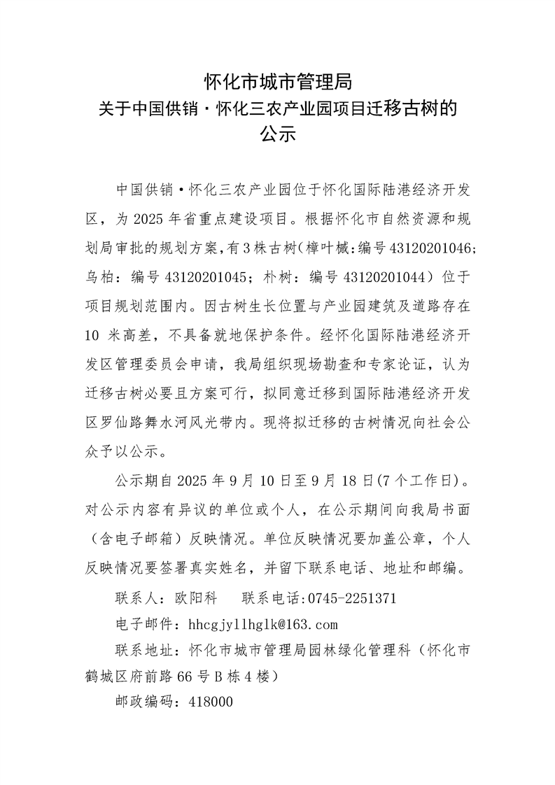 懷化市城市管理局關(guān)于中國(guó)供銷(xiāo)·懷化三農(nóng)產(chǎn)業(yè)園項(xiàng)目遷移古樹(shù)的公示