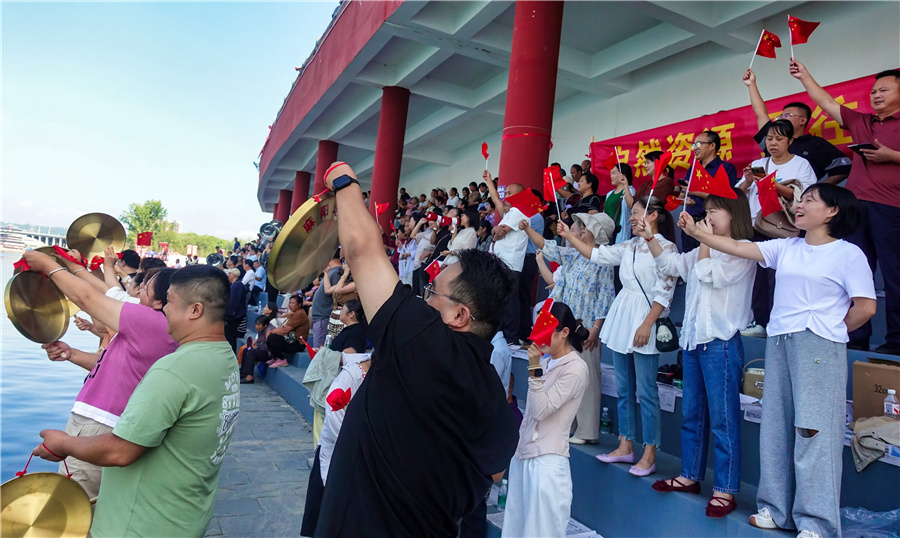 9月28日,2025年麻陽干部職工龍舟大賽在縣城錦江河段鳴鑼開賽,56支隊伍參與比賽,賽期3天。本次賽事項目為男女混合22人標(biāo)準(zhǔn)龍舟300米直道競速。(陳剛 攝)