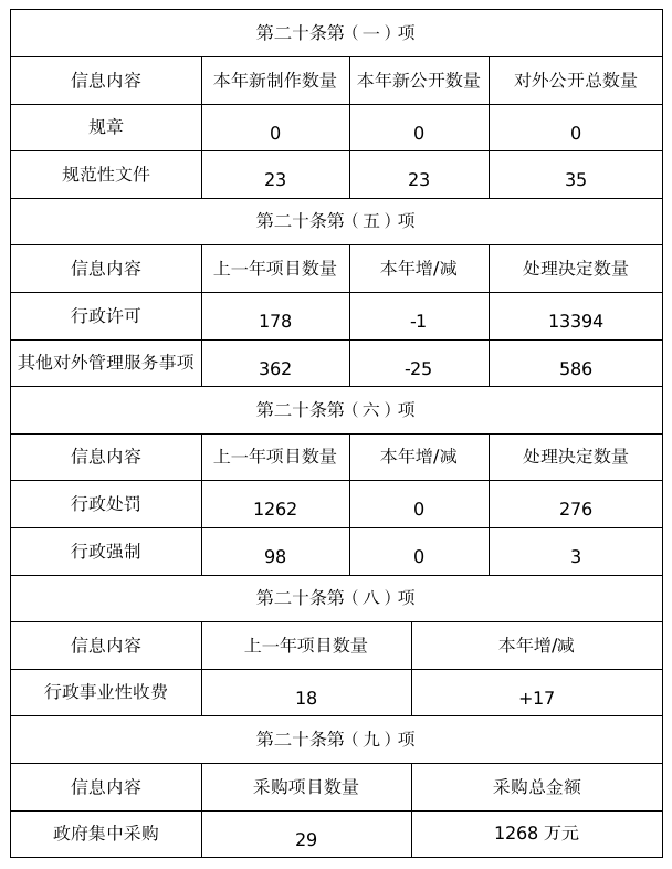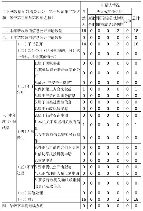 本年度報告根據(jù)《中華人民共和國政府信息公開條例》(以下簡稱《條例》)、湖南省政務(wù)公開領(lǐng)導(dǎo)小組辦公室《關(guān)于貫徹落實(shí)(中華人民共和國政府信息公開條例)實(shí)施方案》(以下簡稱《實(shí)施方案》)及《懷化市政府信息公開實(shí)施細(xì)則》(以下簡稱《細(xì)則》)的有關(guān)規(guī)定,由鶴城區(qū)政務(wù)公開領(lǐng)導(dǎo)小組辦公室編制。全文由總體情況、主動公開政府信息情況、收到和處理政府信息公開申請情況、政府信息公開行政復(fù)議行政訴訟情況、存在的主要問題及改進(jìn)措施等五部分組成。本報告的統(tǒng)計數(shù)據(jù)時限為2020年1月1日至12月31日,通過懷化市鶴城區(qū)人民政府門戶網(wǎng)站對外公布。如對報告有任何疑問、意見,請與懷化市鶴城區(qū)政務(wù)公開領(lǐng)導(dǎo)小組辦公室聯(lián)系(地址:懷化市鶴城區(qū)政府智慧政務(wù)樓四樓,郵編:418000,電話:0745-2338221,電子郵箱:hcqzwzx@126.com)。