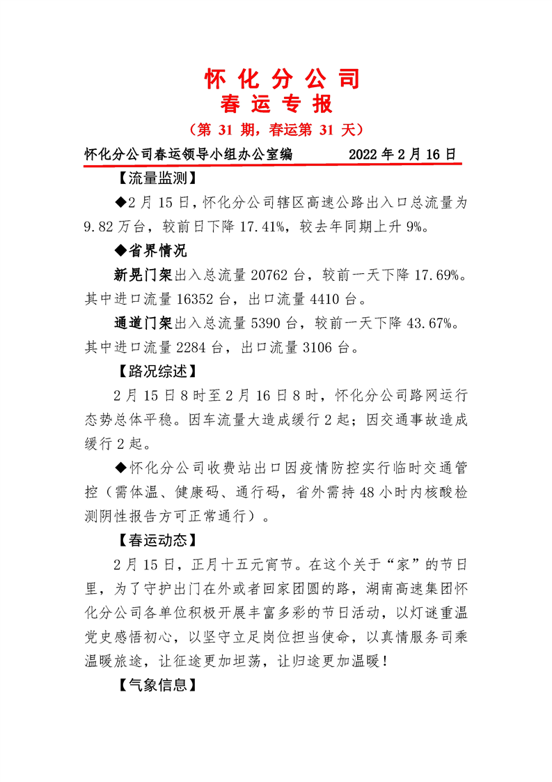 2022年高速懷化分公司第31期春運(yùn)專報(bào)