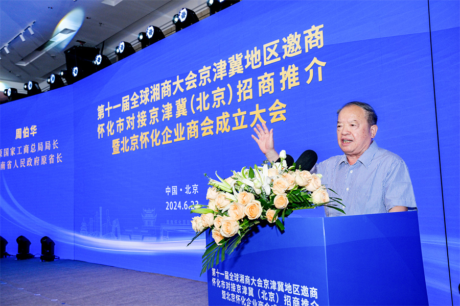 6月23日下午,第十一屆全球湘商大會(huì)京津冀地區(qū)邀商、懷化市對(duì)接京津冀(北京)招商推介暨北京懷化企業(yè)商會(huì)成立大會(huì)在北京舉行。圖為原國家工商總局局長、湖南省政府原省長周伯華出席并講話。(懷化日報(bào)全媒體記者 潘雨 攝)