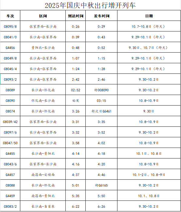 記者從懷化高鐵南站獲悉,為更好地滿足廣大旅客的出行需求,懷化高鐵南站將加開多趟列車,服務(wù)旅客探親、旅游出行。具體如下: